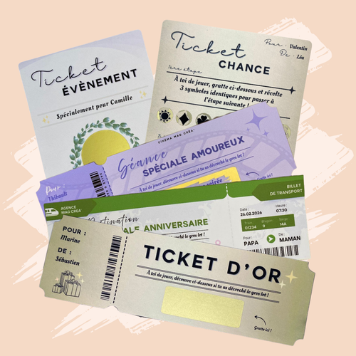 Merci de bien détailler votre demande : type de ticket, personnalisation souhaitée (pour qui ? de qui ? texte sous la pastille à gratter), quantités, couleurs, date butoir, etc.